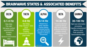 As explained above, binaural beats can entrain the brain to different states, of which there are five key categories shown here